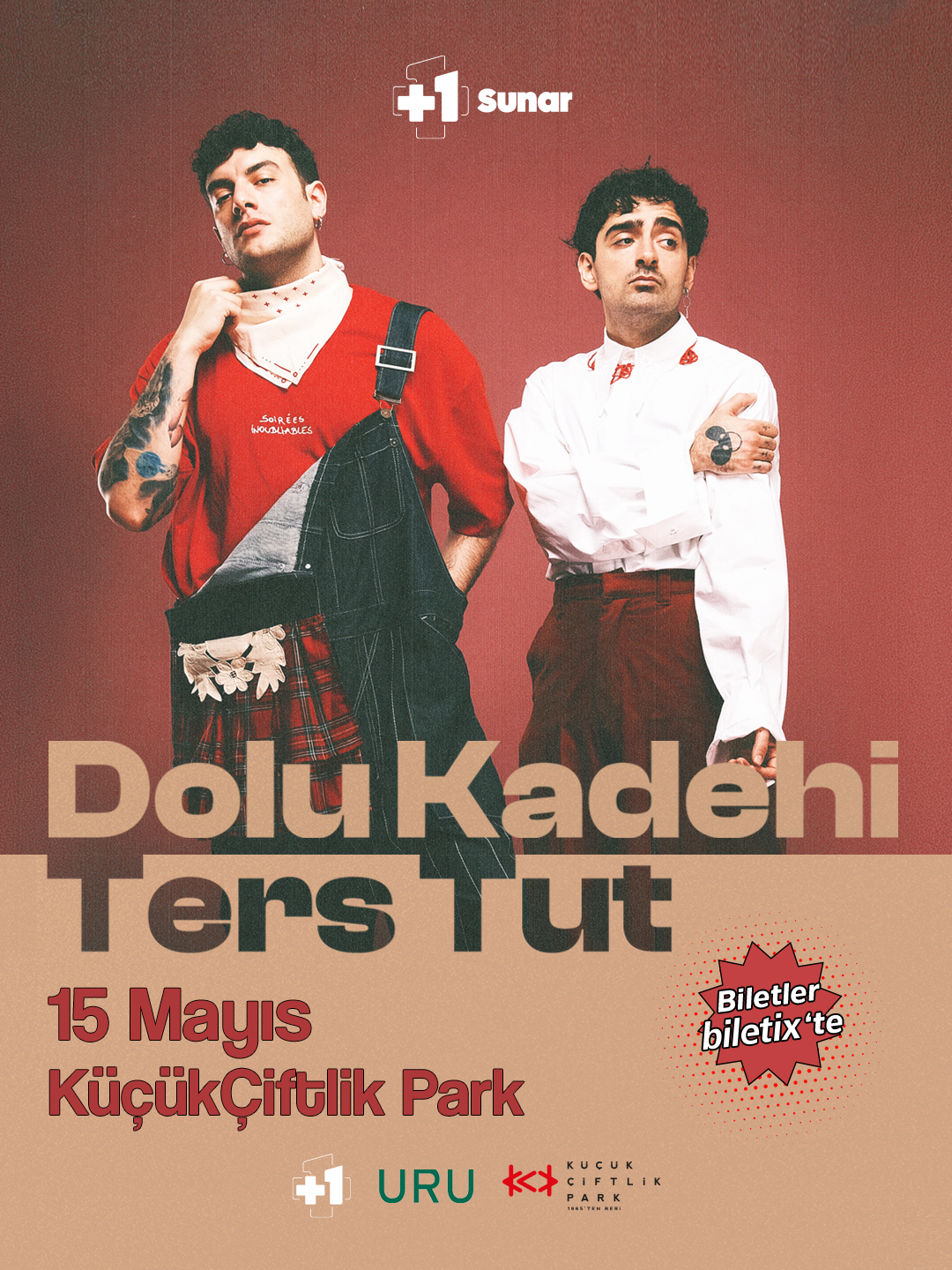 Yerli alternatif müzik sahnesinin en sevilen gruplarından Dolu Kadehi Ters Tut, 15 Mayıs’ta KüçükÇiftlik Park sahnesinde! Canlı performanslarında seyirciyle kurduğu doğrudan ve samimi bağla tanınan ikili, geçmişten bugüne şarkılarını, hayranlarından oluşan kalabalık bir koroyla hep bir ağızdan seslendirecek. +1 katkıları ve URU organizasyonuyla düzenlenen konserlerin biletleri Biletix’te ve KüçükÇiftlik Park gişesinde!